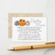 This small enclosure card features three adorable pumpkins in orange, black and white plaid, and leopard print. The orange pumpkin is accented with pretty yellow sunflowers. "Display Shower" in a handwritten cursive typography is featured at the top along with a sweet poem. The back of the card is a burlap print and allows plenty of room to add any additional details or text.