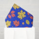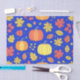 Wrap your gifts in the essence of autumn with this vibrant fall tissue paper. Set against a deep blue backdrop, the design features an inviting pattern of warm-hued pumpkins in sunny yellow and soft orange. A vibrant scatter of crimson and gold leaves, along with tiny berries and flowers, completes this festive harvest pattern, perfect for adding a touch of cosy charm to any package.