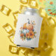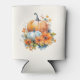 Can cooler with a fall themed image. Orange and white pumpkins surrounded by fall leaves and orange flowers.