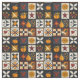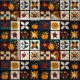 This fabric features a quilt-inspired patchwork pattern arranged in a grid of dark and light squares. Each block highlights unique motifs, from appliquéd pumpkins, autumn leaves, and birds to geometric piecing such as stars, pinwheels, and chequerboard designs. Rendered in warm fall shades of orange, red, yellow, and brown against contrasting cream and dark blue backgrounds, it captures the cosy charm of handmade quilting. Perfect for rustic farmhouse décor, harvest season crafts, and primitive folk art enthusiasts who love autumn style.