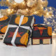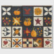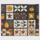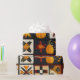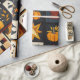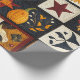 This wrapping paper features a quilt-inspired patchwork pattern arranged in a grid of dark and light squares. Each block highlights unique motifs, from appliquéd pumpkins, autumn leaves, and birds to geometric piecing such as stars, pinwheels, and chequerboard designs. Rendered in warm fall shades of orange, red, yellow, and brown against contrasting cream and dark blue backgrounds, it captures the cosy charm of handmade quilting. Perfect for rustic farmhouse décor, harvest season crafts, and primitive folk art enthusiasts who love autumn style.
