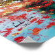A woman with a blue umbrella walks through the Autumn rain in this painting. Vibrant red and orange were used in this scene using oil paint on canvas.