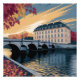 This stylized illustration captures a serene European riverside scene framed by warm autumn foliage and classic architecture. The balanced composition highlights a grand riverside building, an elegant stone bridge, and rich reflections across calm water. With a refined poster-style aesthetic, simplified shapes, and a striking seasonal color palette, this artwork delivers a timeless, atmospheric mood perfect for lovers of travel-inspired cityscapes, architecture, and fall-themed visual storytelling.
