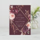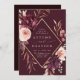 This wedding invitation features a watercolor flower wreath of dahlias, garden roses, and peony in burgundy red, maroon, blush pink over fall leaves with a faux gold diamond shape frame. For more advanced customisation of this design, please click the BLUE DESIGN TOOL BUTTON. Matching items are also available.