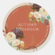 Autumn roses and delicate watercolor greenery leaves on a terra cotta with a chocolate brown border and tapioca background. Chic bridal shower.