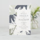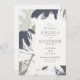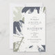 These light and airy 5" x 7" wedding invitations features an abstract leaf design in shades of sage and navy with the message, "Please join us for the marriage of," with placeholders for the bride and groom's first and last names, time-written out, date, month, year-written out, wedding venue and city state.