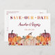 Autumn Save Our Date Announcement Postcard with fall florals and pumpkins in russet brown, tangerine orange, deep merlot, burgundy, and winter cream tones.