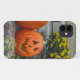 A pumpkin, jack-o-lantern and yellow mums are perfect for an autumn display.