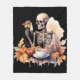 A spooky skeleton with a cup of coffee, pumpkins, and fall leaves.