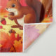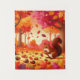 A vibrant tapestry design featuring a squirrel amidst a colourful autumn forest, with falling leaves and scattered acorns, evoking the cosy essence of fall.