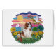 The autumn sun shines down on a Blenheim Cavalier King Charles Spaniel sitting against a background of colourful autumn foliage while a dove flies off and a bluebird sings on a branch full of brightly coloured leaves.