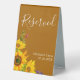 Pretty Autumn/ Fall wedding Reserved table tent signs feature watercolor sunflower bouquet on golden brown background with white customisable text blocks in modern fonts