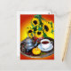 A silver tea tray decorated for autumn with a china teacup, antique silver teapot, sunflowers, and a pumpkin set against a red and yellow background. This fall tea service is perfect for tea parties, thanksgiving, or just sending and receiving some autumn love. This postcard is fully customisable.