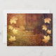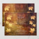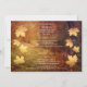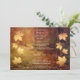 This autumnal themed rustic wedding details card features a peaceful, tree-lined walking trail resplendent in a stunning fall colour palette in shades of gold, orange and red - semitransparent maple leaf shapes line the right and left edge - by katz_d_zynes