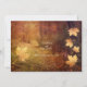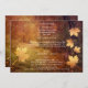 This autumnal themed rustic wedding details card features a peaceful, tree-lined walking trail resplendent in a stunning fall colour palette in shades of gold, orange and red - semitransparent maple leaves line the right edge with a single maple leaf on the left edge - by katz_d_zynes