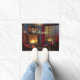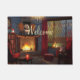 A cosy reading corner on a rainy autumn day. Around the hearth with a blazing fire are cushy red armchairs, with stacks of books and teacakes and a teapot to complete the comfort. Outside a yellow willow and red maple and beech hedge are obscured by the blowing rain, which sprinkles the window where a ginger cat sits looking out.