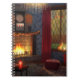 A cosy reading corner on a rainy autumn day. Around the hearth with a blazing fire are cushy red armchairs, with stacks of books and teacakes and a teapot to complete the comfort. Outside a yellow willow and red maple and beech hedge are obscured by the blowing rain, which sprinkles the window where a ginger cat sits looking out.
