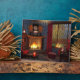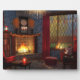 A cosy reading corner on a rainy autumn day. Around the hearth with a blazing fire are cushy red armchairs, with stacks of books and teacakes and a teapot to complete the comfort. Outside a yellow willow and red maple and beech hedge are obscured by the blowing rain, which sprinkles the window where a ginger cat sits looking out.