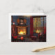 A cosy reading corner on a rainy autumn day. Around the hearth with a blazing fire are cushy red armchairs, with stacks of books and teacakes and a teapot to complete the comfort. Outside a yellow willow and red maple and beech hedge are obscured by the blowing rain, which sprinkles the window where a ginger cat sits looking out.