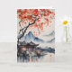 Bright orange and red autumn leaves drife around a temple beside a mountain lake on this beautiful birthday card that illustrates the concept of wabi-sabi.