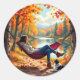 Pretty Fall themed stickers to seal your envelopes or decorate your notebooks with an ai illustration of a woman relaxing in a hammock and a background of orange Fall leaves reflecting in a little pond. A dog relaxes on the ground next to her.