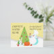 Snowman chef with spoon, Christmas tree, pumpkin, fall leaves and a rabbit holding a whisk on a snowy background on this autumn or fall and winter recipe card.