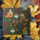 A red fox, rabbit, owl, luna moth, pine marten with autumn leaves, pumpkins, flowers and acorns in a backdrop of deep green
