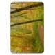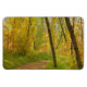A photograph of a walking trail through autumn coloured trees of yellow and some green