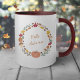 A Mug with an Autumn Wreath and its maple, beech, oak and hazel leaves, mushroom, acorn, pumpkin, chestnuts and walnuts in fall colours. It also includes a customisable text and a monogrammed letter! Perfect for a gift to a girlfriend or a lover of nature and autumn feeling!
