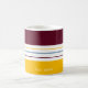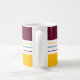 This modern coffee mug features a colourful autumnal pattern in mulberry purple, amber yellow, and white stripes. Personalise it with a name at the bottom.