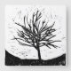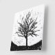 Black and white lino print of an autumnal tree's silhouette.
