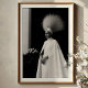 Command attention with this stunning black and white art print, a true masterpiece of avant-garde fashion and artistic expression. This striking portrait features a woman of majestic poise, crowned with an extraordinary, voluminous white headpiece that radiates upwards with sharp, intricate spikes, adorned with delicate embellishments. Dressed in a pristine white, high-collared gown and a sweeping cape, her minimalist attire provides a sophisticated canvas for the dramatic headwear. Her dark skin tone beautifully contrasts with the pure white garment, creating a powerful visual statement. Rendered in high-contrast monochrome against a captivating split backdrop of deep black and soft grey, this artwork emphasizes form, texture, and the powerful presence of the subject. Perfect for modern living spaces, fashion studios, or any decor seeking a touch of unique elegance, bold artistry, and a truly unforgettable visual narrative.