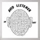Avid listener text and a maze in the shape of a face with the words in and out at the ears is a humourous puzzle design for birthdays and holidays and teacher gifts.