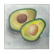 Watercolor painting of a fresh green avocado sliced in half. Grayish and blue mottled background.