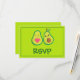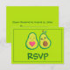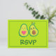 A fun and colourful avocado themed hipster wedding RSVP card, this card features a green background with a happy couple represented by avocados. "RSVP" is written in green fun font. The back also has fun text with easy to fill in templates. Personalise yours today!