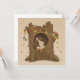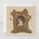 A cute illustration of a beagle in a hollow tree covered in colorful leaves