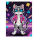 A stylish cartoon cat strikes a confident pose in a neon-lit, retro arcade world. Rocking a hot-pink bomber jacket and cool blue shades, this feline is the embodiment of 80s nostalgia and futuristic flair. With pixel shapes and neon beams glowing in the background, the cat radiates pure confidence and playful swagger.