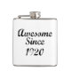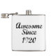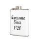 The flask itself is fine. It’s a cheap flask, obviously bought in bulk, however am prepared to overlook that. Given that it is a personalized item, I would have liked to have seen gift boxing instead of the generic packaging. Terrible printing, and/or quality. It’s a cheap, tacky vinyl. It is not cut straight and is also applied in a way that it is overhanging the bottom, causing the glue to catch on items and it will eventually roll and tear, damaging the wrap.