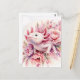 This postcard features an adorable light pink axolotl salamander among flowers in a feminine floral animal portrait. The axolotl has a gentle, whimsical expression, with its distinctive external gills painted in a vibrant pink that harmonises with the overall palette. It is surrounded by lush, blooming flowers in shades of pink and peach, with delicate leaves and botanical elements adding to the composition. The soft and dreamy colour scheme, combined with the detailed depiction of the axolotl and florals, creates a charming and serene image.