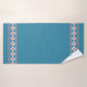 This bath towel set features a border of aztec blue, coral pink, and white geometric diamond shapes on a matching turquoise blue background.The diamond images are contained within a double line frame. The design is at the top and bottom of the large bath towel and the hand towel, and on the bottom of the wash cloth. Beautiful! Be sure to see the matching shower curtain and bath mat in our store.