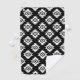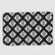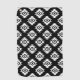 Aztec influenced stylised symbol in a repeat surface pattern design in black and white detail on a black background.