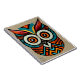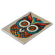 This is a decorative owl made by hand and stylised with Aztec patterns in black, red, turquoise and orange colours.