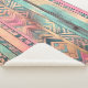 Aztec native American watercolor tribal design featuring a southwestern geometric pattern in pastel blue, pink and orange tones on a wood grain background.