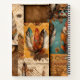 Aztec native American watercolor tribal design of pattern blocked feathers and geometric shapes in brown, orange, adobe desert sand and blue.