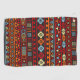 Aztec style pattern in a modern design in orange, yellow, blue and red detail on black.