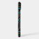 Aztec influenced and stylized mixed motifs pattern in teal, red, dark red and yellow on black.