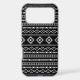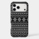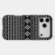 Aztec mixed motifs pattern in black, white and grey detail on a black background monochrome design.