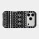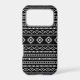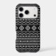 Aztec mixed motifs pattern in black, white and grey detail on a black background monochrome design.