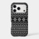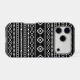 Aztec mixed motifs pattern in black, white and grey detail on a black background monochrome design.