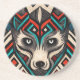 This is a decorative wolf face made by hand and stylised with Aztec patterns in black, red, turquoise and beige colours.